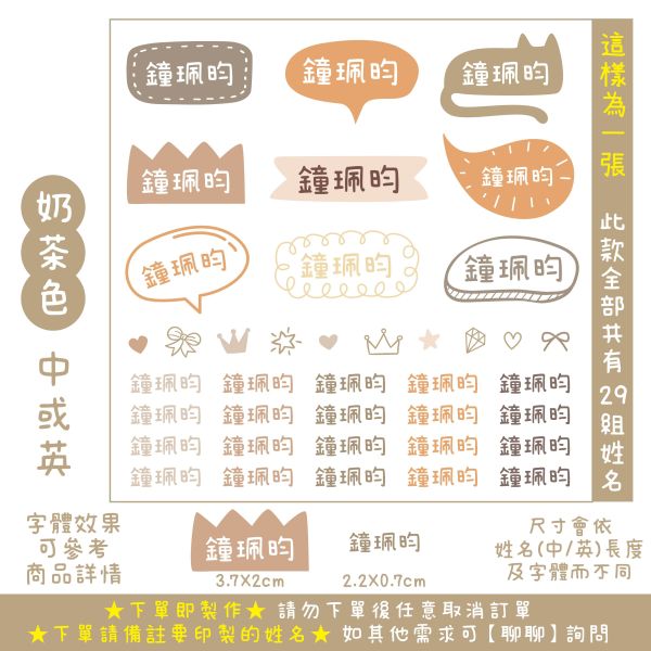 ★沒有校對服務,請至 "商品詳情字體參考" ,因大部分聊聊無法即時回覆,"等待校對"會影響工作進度與交期,如想確認 "文字字體效果" 請先聊聊詢問,小編正努力編排姓名貼中,還請耐心等待。